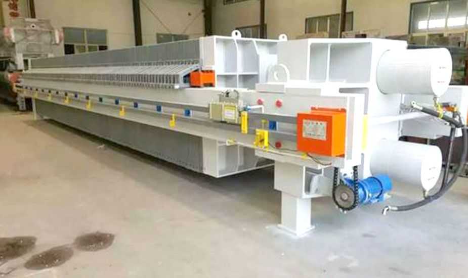 液壓廂式壓濾機由交替排列的濾板和濾框構成一組濾室。濾板的表面有溝槽,其凸出部位用以支撐濾布。濾框和濾板的邊角上有通孔,組裝后構成完整的通道,能通入懸浮液、洗滌水和引出濾液。板、框兩側各有把手支托在橫梁上,由壓緊裝置壓緊板、框。板、框之間的濾布起密封墊片的作用。由供料泵將懸浮液壓入濾室 在濾布上形成濾渣,直至充滿濾室。濾液穿過濾布并沿濾板溝槽流至板框邊角通道,集中排出。過濾完畢,可通入清洗滌水洗滌濾渣。